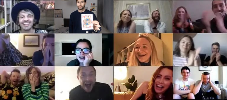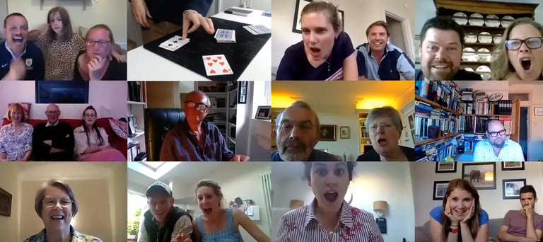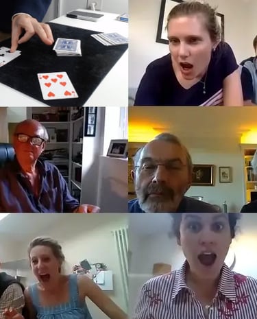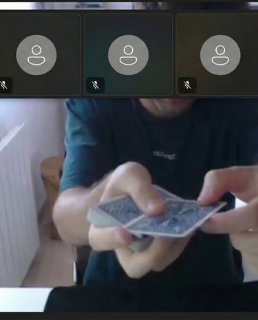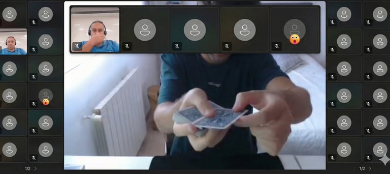 A virtual magic show is a live, interactive performance delivered online through platforms like Zoom or Google Meet. Unlike pre-recorded videos, everything happens in real time: the audience participates, makes decisions and even performs parts of the magic from their own homes.
